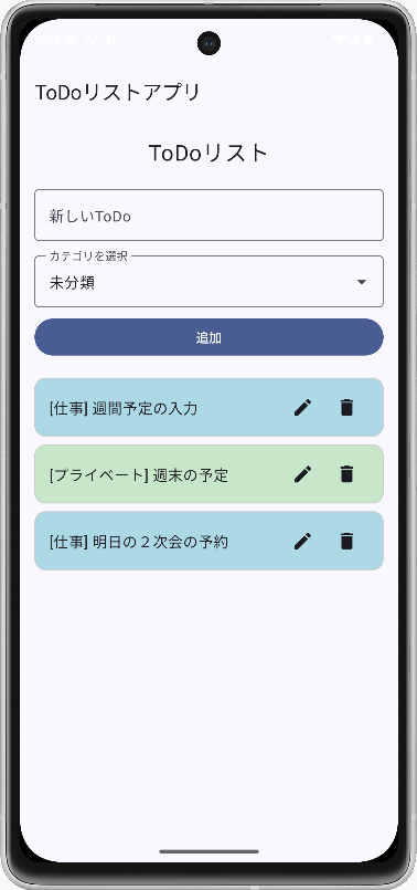 これで、ToDoリストの各項目に編集ボタンと削除ボタンが表示され、編集ボタンを押すとテキストとカテゴリが編集可能になり、保存・キャンセルができるようになります!