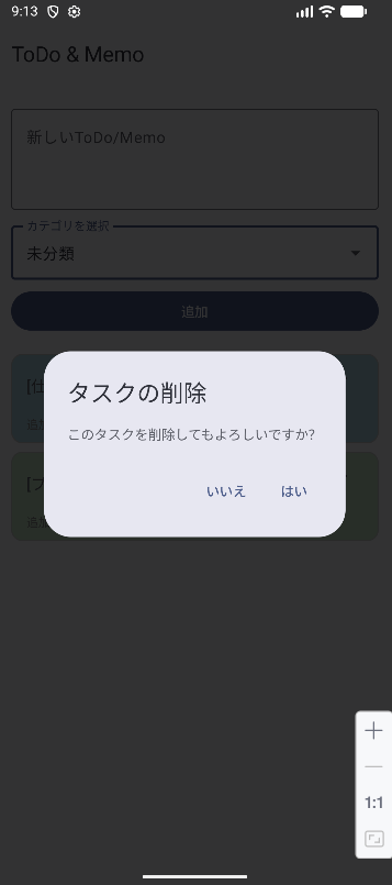 これで、アプリを再実行すると、ToDoリストの項目を削除しようとすると、まず確認ダイアログが表示され、「はい」を押した場合のみタスクが削除されるようになります!