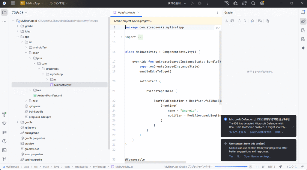 これでAndroid Studioがアプリをビルドし、選択したエミュレータまたは実機にインストールして起動します。