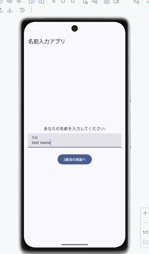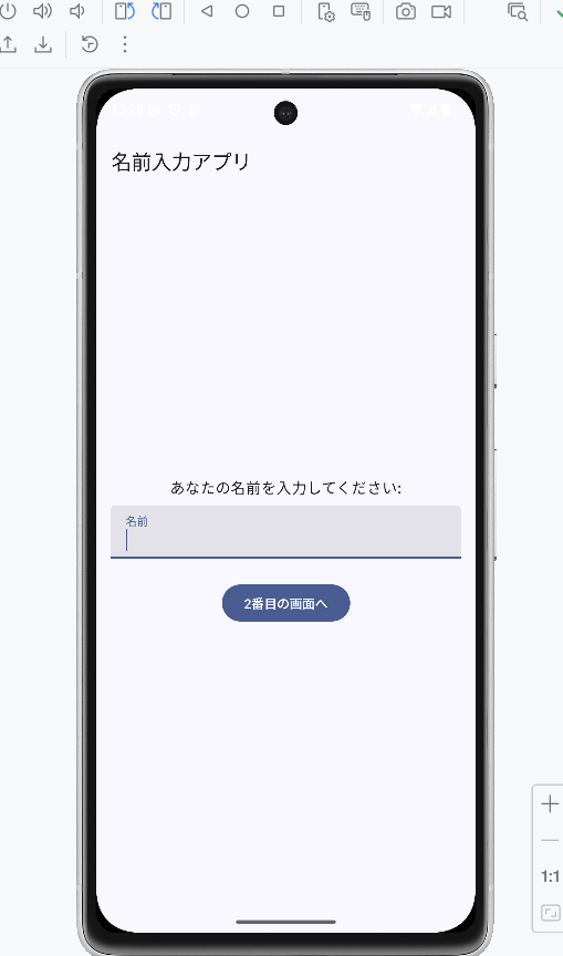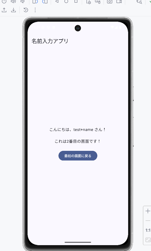 これで、アプリを再実行して、名前を入力し、ボタンを押すと、次の画面で入力した名前が表示されるはずです!