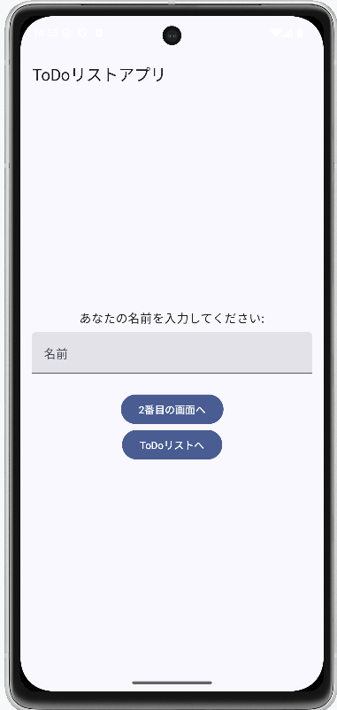 これで、アプリを再実行すると、どこかの画面から「ToDoリストへ」のボタンを押して新しい画面に遷移し、そこにテキストを入力してリストに追加できるToDoリストアプリが完成します!