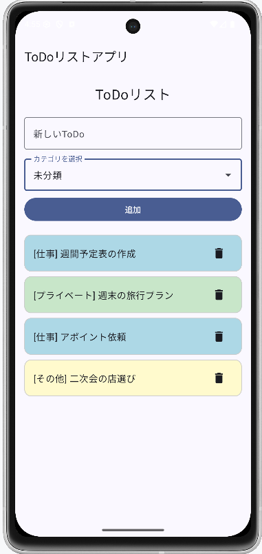 3. TodoListScreen を修正してカテゴリ選択と色分けを実装する