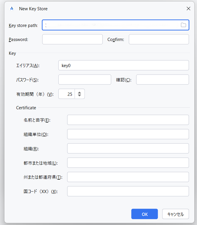 - Password: キーストアファイル自体を保護するパスワードです。忘れないように厳重に管理してください。