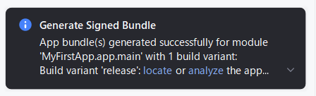 7.「locate」 をクリックすると、エクスプローラー(またはFinder)が開き、生成されたAABファイルが表示されます。通常、ファイルは以下の場所にあります。 [プロジェクトフォルダ]/app/release/app-release.aabこの app-release.aab ファイルを、Google Play Consoleにアップロードしてアプリをリリースします。