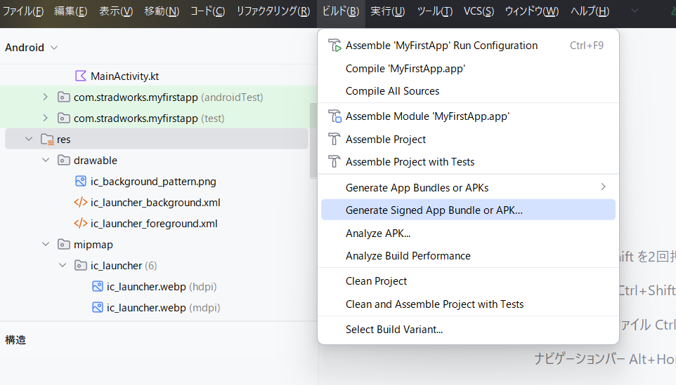 1.Android Studioの上部メニューから [Build] > [Generate Signed Bundle / APK…] を選択します。 Generate Signed Bundle / APK…