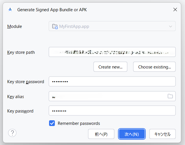 - Key store path: ステップ1で作成したキーストアファイル(.jks)のパスを指定します。